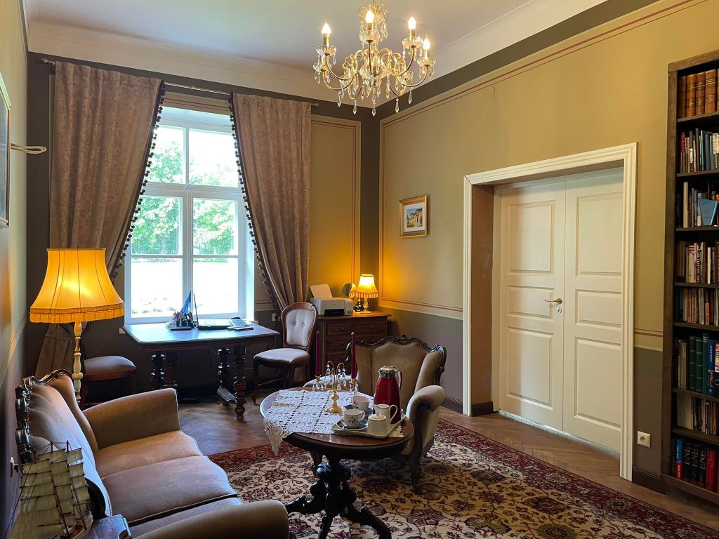 Oleme jõudnud ringikäiguga mõisaproua kabinetti. Kuuldused Evelini käte osavusest peavadki paika. Suurem osa renoveerimistöid on ta ise teostanud, alates akende renoveerimisest ning lõpetades põranda lihvimise ja katuse parandamisega.