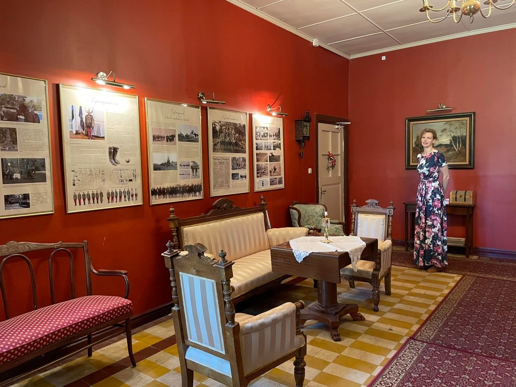 Vestibüüli jõudes jään seisma ja silmitsen interjööri. Evelin selgitab: „Siin seinal on minu koostatud ratsarügemendi näitus.“